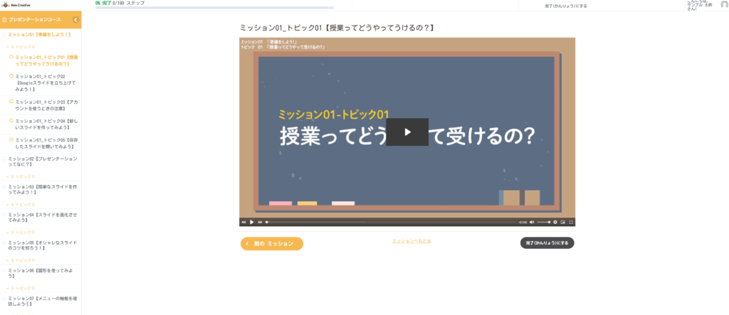 映像が終わったら映像の右下にある「完了する」ボタンを押し、プリントに進むのがBee Creativeの基本の進め方です。
