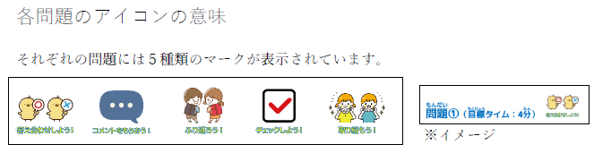 このマークは教室の先生が採点やフィードバックをするなど、どんな動きをする必要があるかを視覚的に表現したものになります。