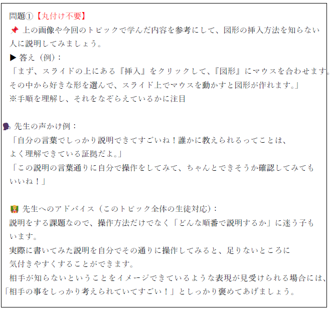 解答集には全ての問題に声掛けなどの例がありますが、基本的な原則としているのは下記の3点です。
