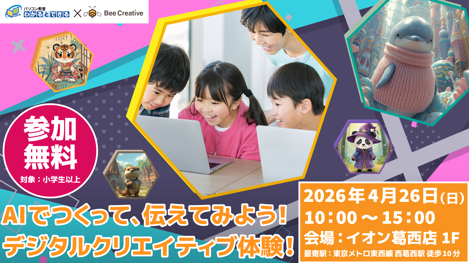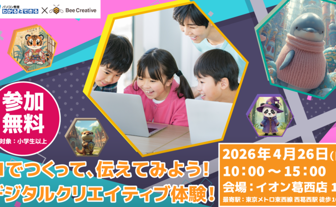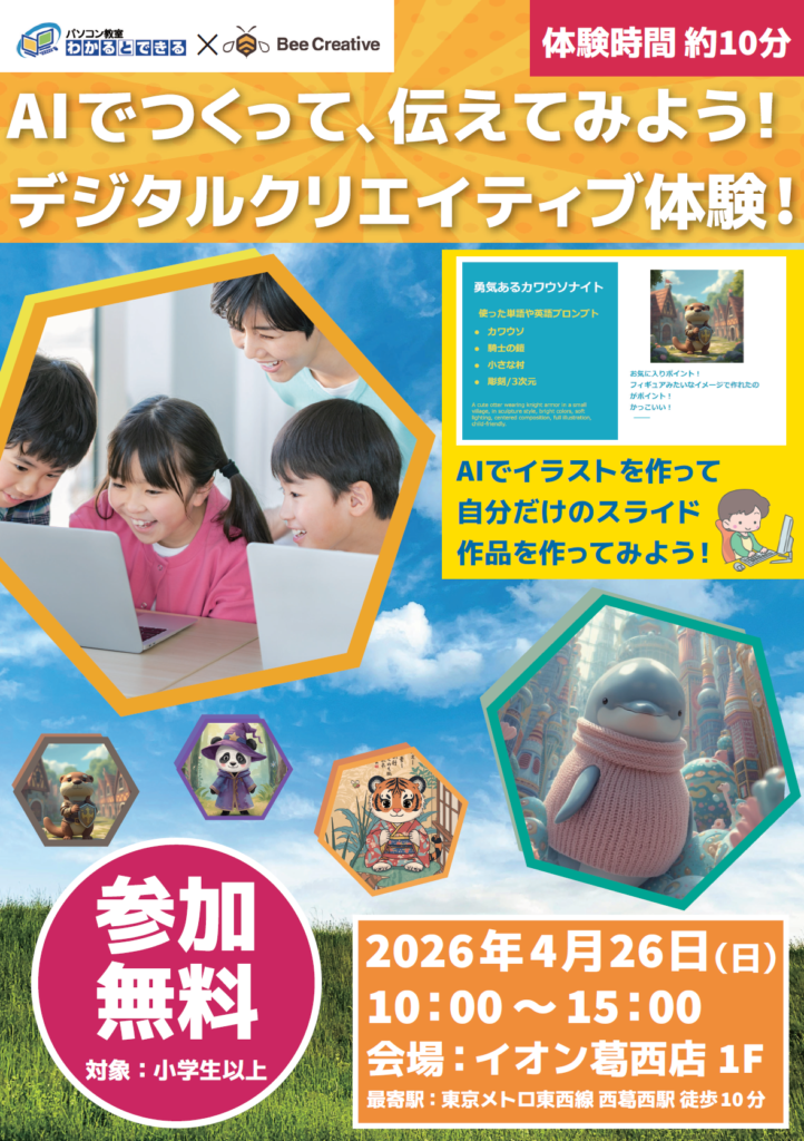 Bee Creativeでは今回、初めてのイベントとして、AIを使ったイラスト制作とスライド作成を通して、作ることと伝えることの両方を体験できる子ども向けイベントを江戸川区西葛西にて開催します。